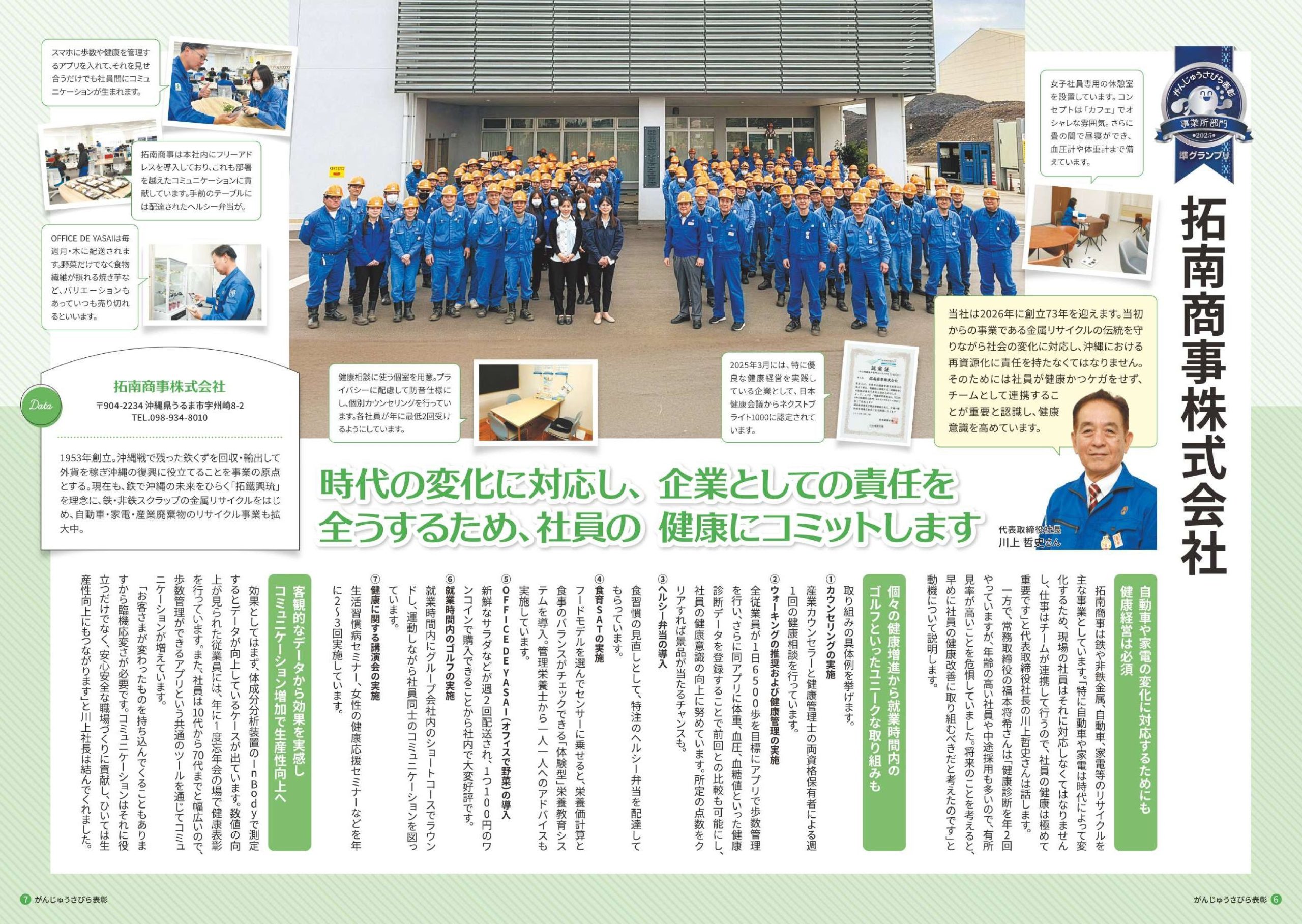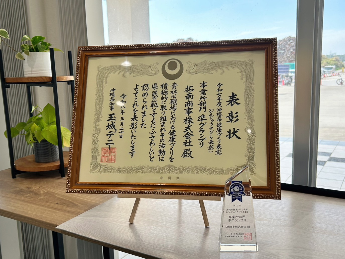 このたび、沖縄県が取り組む「健康長寿おきなわ復活プロジェクト」の一環として実施されている「沖縄県健康づくり表彰(がんじゅうさびら表彰)」令和7年度の選考において、拓南商事株式会社が健康づくり事業所部門の準グランプリに選出されましたので、お知らせいたします。