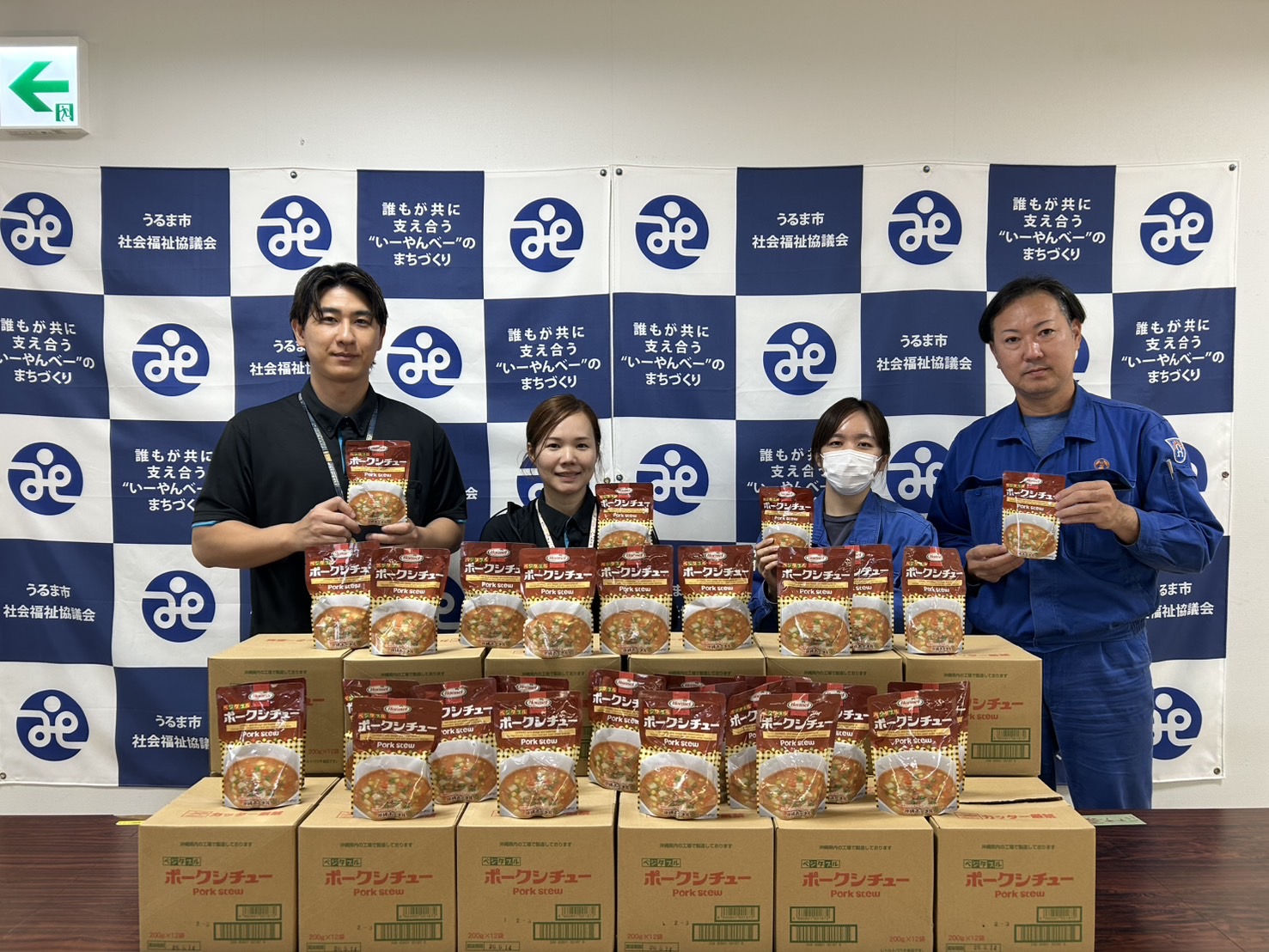 このたび、消味期限が迫った非常用食料品(ポークシチュー222食)を、フードドライブ活動としてうるま市社会福祉協議会へ寄付いたしました。これで当社からの食料品の寄付は6回目となります。