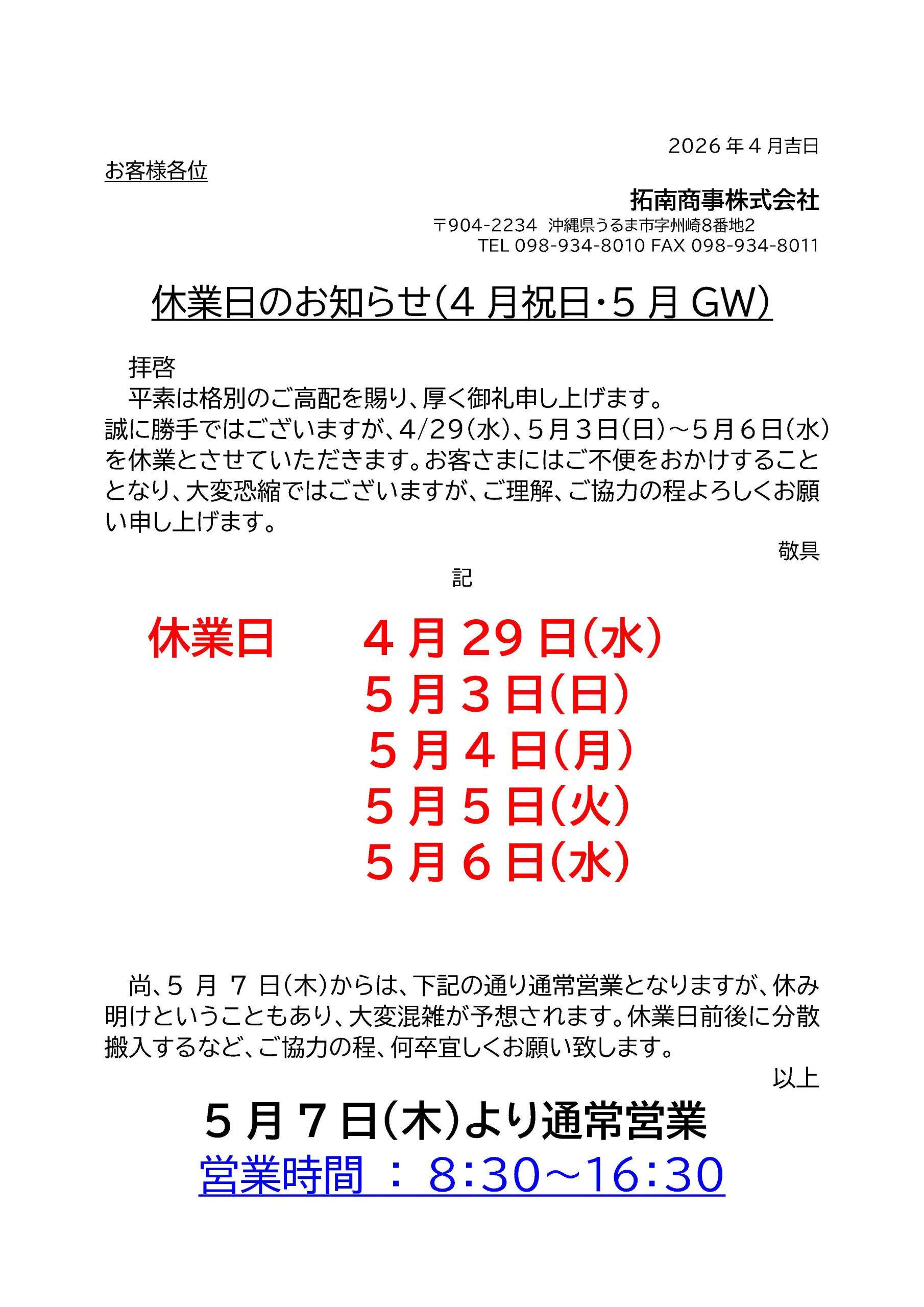 4月、5月休業日のお知らせ